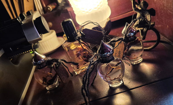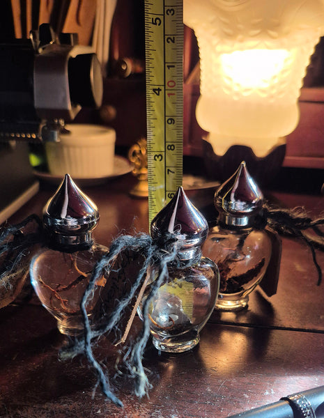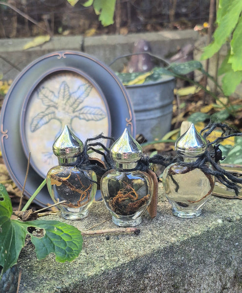 Genuine Mandrake Officinarum root in a wet solution. Home grown from seeds at Ravenwyck Gardens. These were a few years old and loved deeply and cultivated with spirit and magic. Unfortunately we lost power during a winter freeze/storm with -20 below 0 temps and we had roots freeze. We did our best to trim and repair but indications were there that the root was failing. These wee sprouts are very hard to cultivate and grow in general... least the extreme temps get to them. We decided to harvest and dry some and also do some specimens before the root dried and deteriorated further. These specimens can have a shelf life of approx. 10 years if stored out of direct sunlight and extreme temps. These are meant to be companions. Their plant spirits were honored and given this vessel as a new resting place. They were a part of our family and we wish they be honored into yours respectfully.