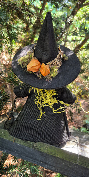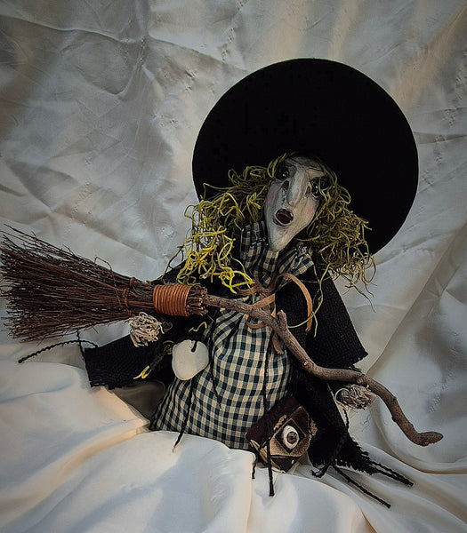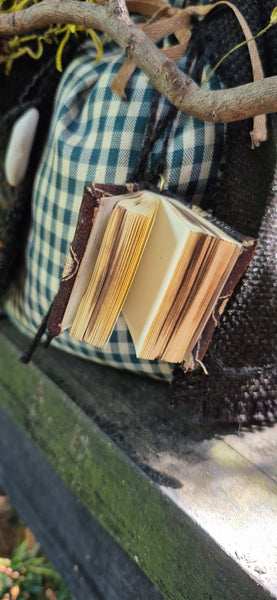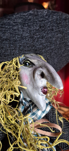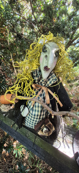 The 'Spell Caster' is approx. 12 inches tall with their hat on. "Moss' Hair is lime green, they are stuffed with sand, soil, herbal blend for protection, has faux bark and moss on their hat, a small hag stone from Ireland and book of shadows hang from their waist, and are holding a detachable curly willow twig and broom broomstick. The Hat is also detachable and arms are slightly posable. Head is sculpted of clay and painted with crystal infused acrylics. Each has a unique scent which will come in a sample vial for future anointing. Madame Aine creates from her Awen or source center, inspired by the Muse of Intuition. The faces are hand sculpted first and she channels the identity and energy { Soul imprint ) and awakens to the personality and purpose of each Folk Faerie thusly. Each are unique creations and should be honored as a symbol of Spiritual Kinship. These are not toys. They are Spiritual companions. An Anam Cara or Soul Friend birthed from AWEN /|\